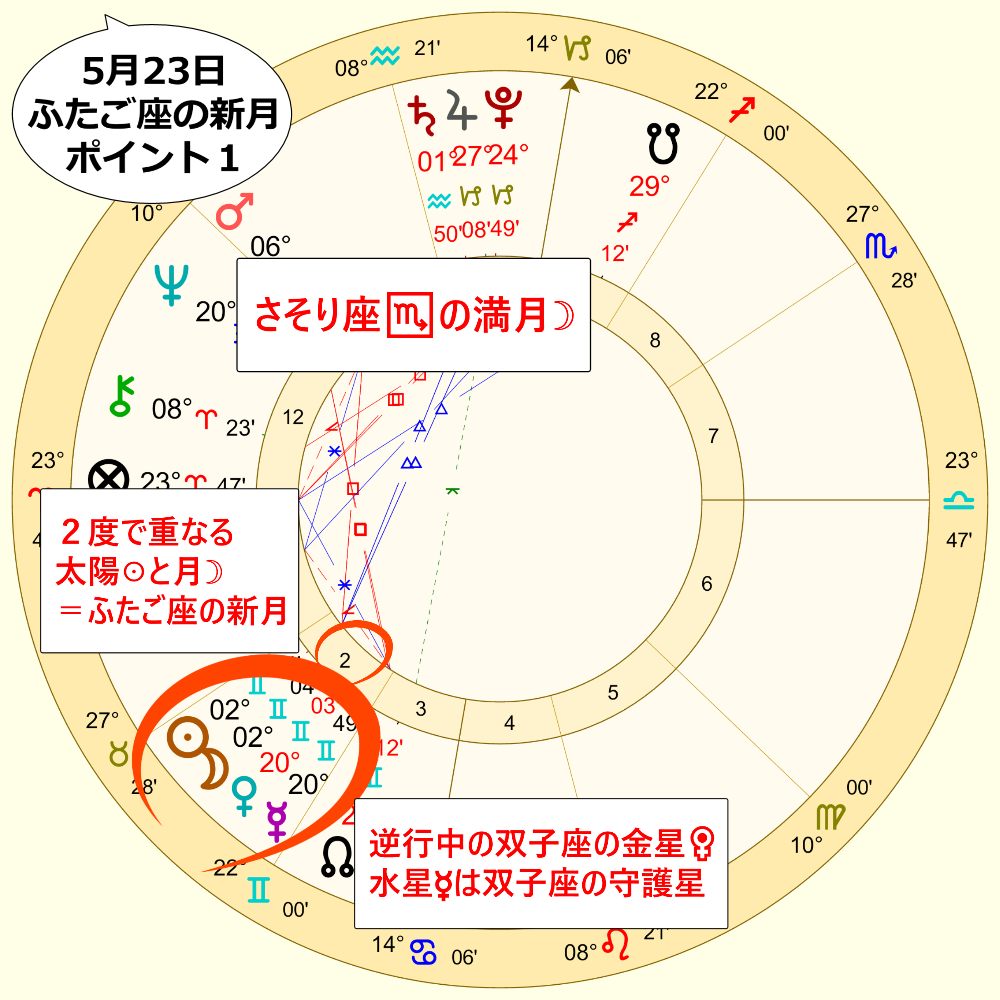 守護星も同じハウスに滞在している新月なので、いろいろなところでふたご座のエネルギーがとても強い新月だということがわかります。